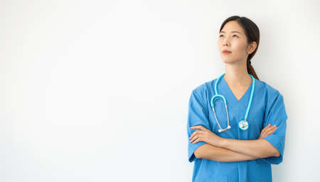 Asian doctor or nurse wear blue scrubs uniform with stethoscope. Physician stand with arms crossed isolated on white background. Healthcare professional. Health insurance concept. Expertise doctor.
