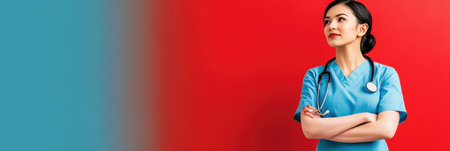 Inspiring midwife stands confidently against a bold red background, embodying strength and care on International Midwives Day, celebrating every May to honor dedication.