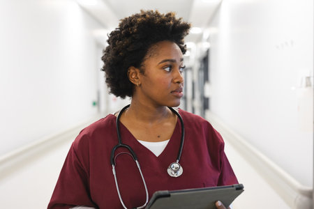 African american female doctor wearing scrubs and stethoscope, using tablet in corridor at hospital. Hospital, communication, medicine, healthcare and work, unaltered.