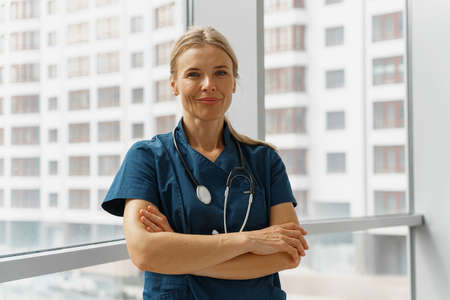 Portrait of professional doctor therapist standing near window in private medical clinic