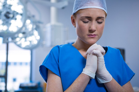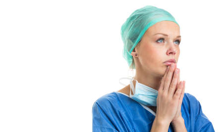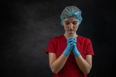 Portrait woman doctor in uniform closed her eyes, clasped her hands and praying to God. concept of faith and hope