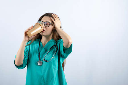 Young attractive nurse with stethoscope drinking from a cup of coffee