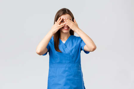 Healthcare workers, prevent virus, insurance and medicine concept. Cute female nurse or doctor in clinic wearing scrubs, cover eyes and peeking through fingers with intrigued smile