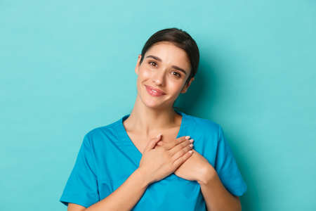 Virus, social distancing and health concept. Close-up of smiling attractive female doctor, feeling grateful, holding hands on heart and looking with gratitude, standing over blue background
