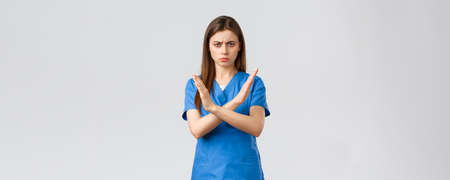 Healthcare workers, prevent virus, insurance and medicine concept. Angry serious-looking nurse, doctor in blue scrubs cross hands in stop sign, prohibit or forbid action, frowning displeased