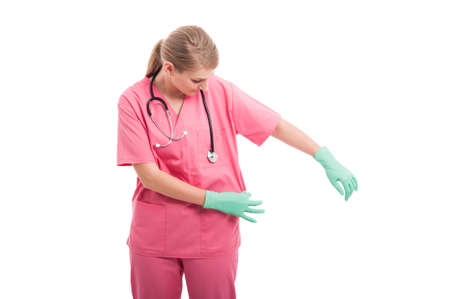 Portrait of young female doctor putting on protective medical face mask on white background, copy space