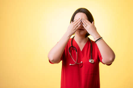 Portrait of nurse wearing red scrub covering eyes like blind concept on studio gray background