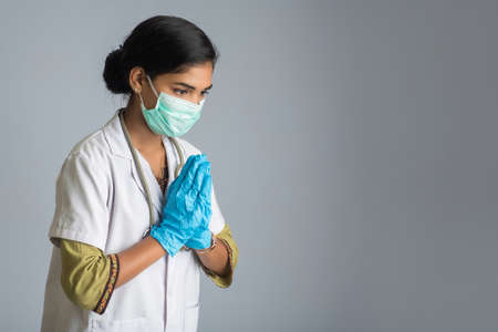 Young woman Doctor doing Namaste because of outbreak of COVID-19. New greeting to avoid the spread of coronavirus instead of greeting with a hug or handshake.