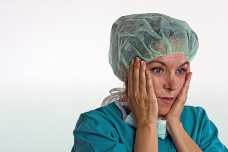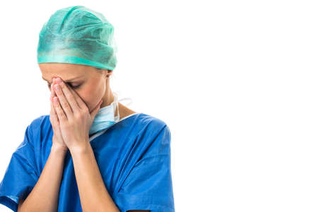 Portrait of a female doctor feeling down, exhausted, frustrated, very tired, .... on white background