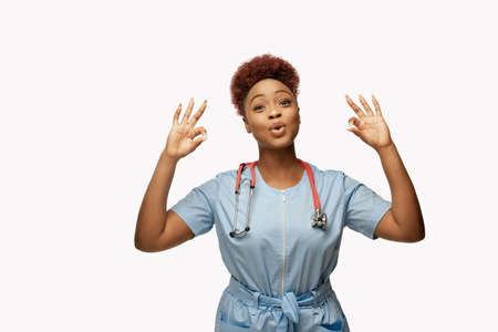 Nice. Beautiful young african-american doctor or nurse with stethoscope smiling isolated over white studio background. Copyspace. Concept of healthcare and medicine, taking care, treatment.