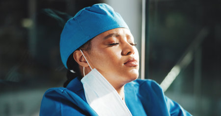 Tired surgeon after surgery. Woman surgeon while sitting at hospital corridor after surgery - concept of exhausted, overworked and fatigue. Epidemic, pondemic lack of medical personnel