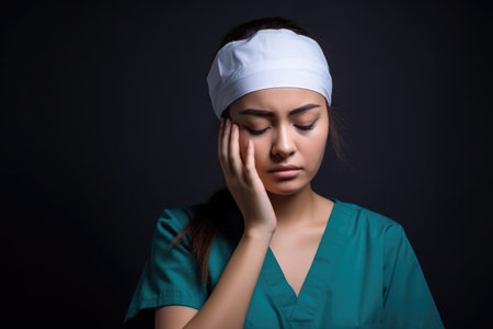 A woman doctor in uniform has stress and prayer during an outbreak of Coronavirus or Covid19, emotional stress overworked by a doctor. Copy space on bright stylish dark background.