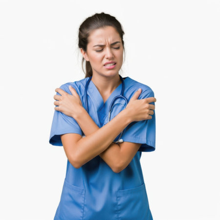 A young female nurse in blue scrubs crosses her arms, grimacing with her eyes closed, appearing to be cold or in pain.