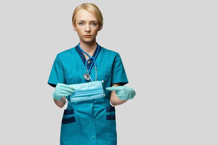 medical doctor nurse woman with stethoscope over light grey background - showing protective mask