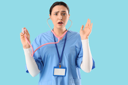A spirited young healthcare professional in invigorating blue scrubs exudes playful energy, her infectious smile illuminating the blue backdrop With a stethoscope gracefully draped around her neck, she embodies confidence and a passion for providing exceptional care AI Generative