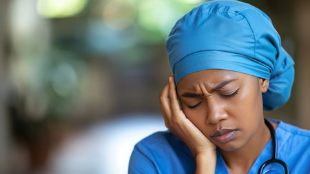 Female nurse in blue scrubs holding head in emergency corridor illustrating healthcare burnout hospital stress and need for mental health support
