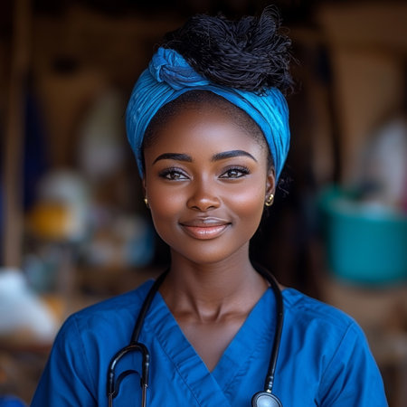 Portrait of a smiling healthcare professional in blue scrubs and headwrap, symbolizing confidence and expertise in the medical field, conveying warmth and professionalism.