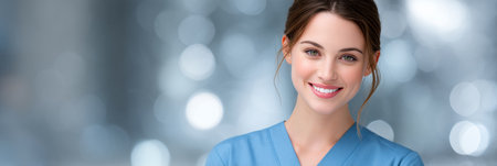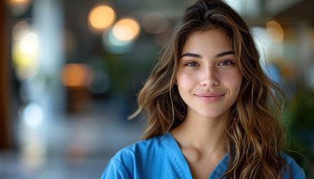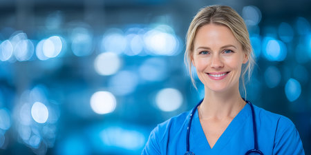 Portrait of a Smiling Female Healthcare Professional in Blue Scrubs, Against a Bokeh Background