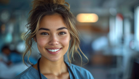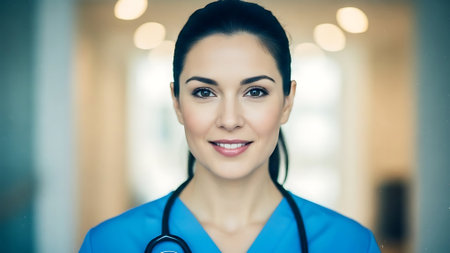 A close-up portrait of a smiling female doctor wearing scrubs and a stethoscope, conveying compassion and professionalism.