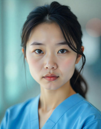 korean nurse's face, close-up, smiling slightly, bright daylight, hospital environment blurred background, with blue uniform.