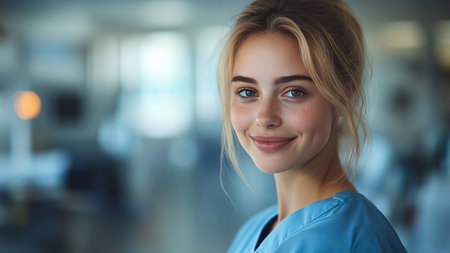 A smiling nurse in blue scrubs standing in a brightly lit hospital corridor, exuding warmth and care