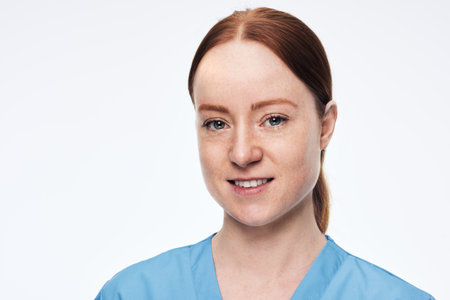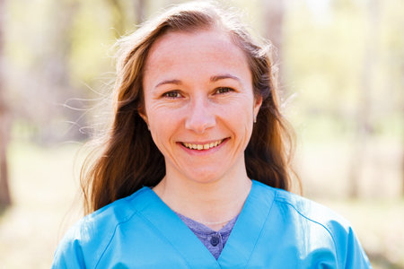 Portrait of smiling woman european nurse looking at camera in corridor of hospital, bright daylight, hospital environment blurred background, with freckles.