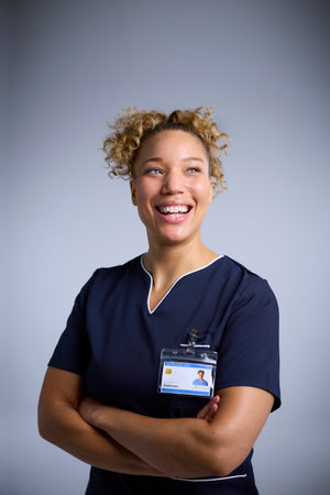 A smiling woman, dressed in blue medical scrubs, wears a stethoscope around her neck. She appears confident and is likely a Doctor or Nurse at a Hospital.