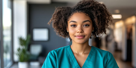 Joyful healthcare worker in blue scrubs, wearing a stethoscope, stands confidently in a bright medical setting, embodying professionalism and compassion, AI generated