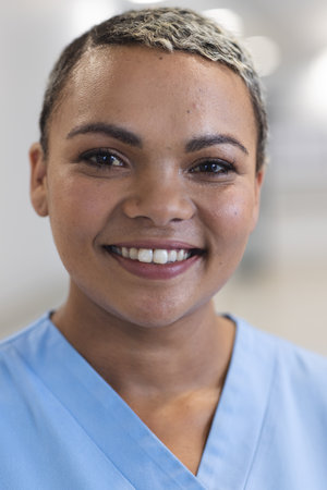 Portrait of happy biracial female doctor with short hair wearing scrubs in corridor at hospital. Medicine, healthcare, work and hospital, unaltered.