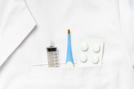 Medical equipment. Coronavirus protection. Medical face mask. Sterile gloves. Syringe and drugs. Doctor uniform for patient treatment in hospital. Prevention the spread of COVID-19.