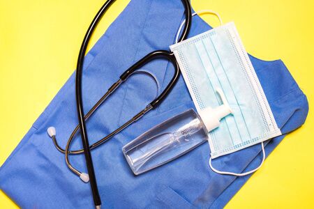 stethoscope with a mask and a hand dispenser on a blue medical uniform