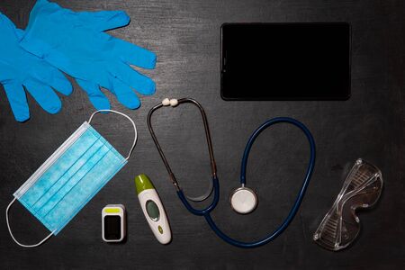 Doctor's equipment for taking tests for infection with the virus Covid-19-stethoscope, thermometer, oximeter, safety goggles, medical mask, disposable gloves and Tablet PC