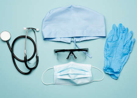 textile blue cap, disposable medical mask, pair of gloves and plastic glasses on a blue background, top view. Medic protective clothing