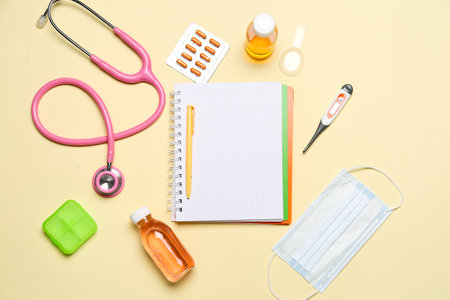 Flat lay view of medical and healthcare background concept. Space for your text. Top view essential items for doctor using treat and care patient in hospital. Object on yellow background.