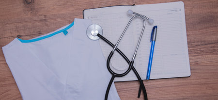 Pen, stethoscope, lying on a medical gown. Doctor's Day. Close-up, no people. flat lay