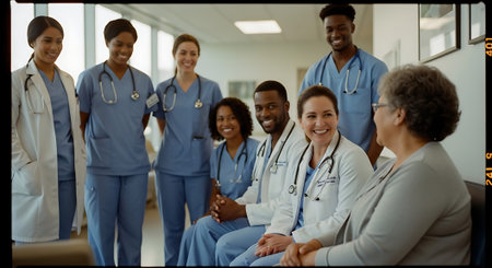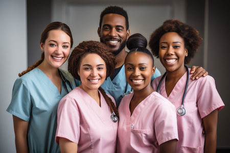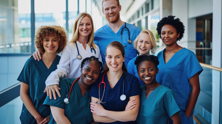Hospital staff from different backgrounds posing together, healthcare teamwork in action