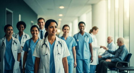 Diverse professionals in medical team confidently smiling in hospital hallway. Concept Medical professionals, Hospital setting, Diverse team, Smiling confidently, Hallway portrait