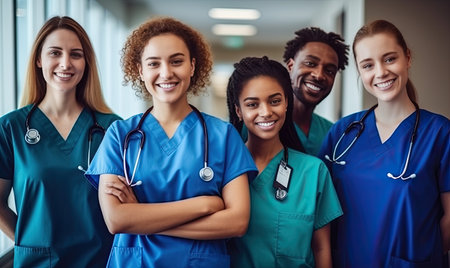 A group of young diverse medical students and nurses standing together and smiling in a hospital or clinic setting showcasing the collaborative positive