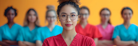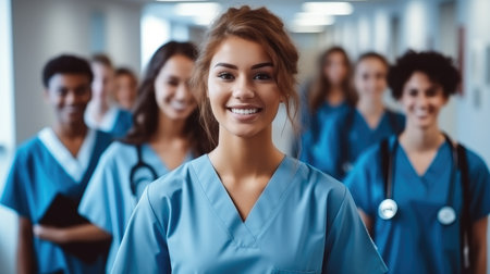 Portrait of a young nursing student standing with her team in hospital, dressed in scrubs, Doctor intern . High quality photo