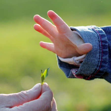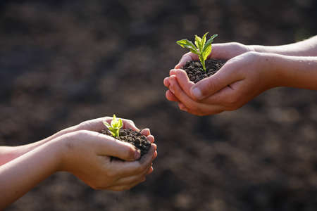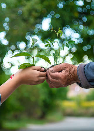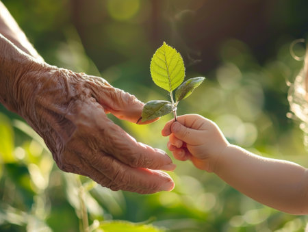 Elderly hands pass a young plant to a child's hand, highlighting the connection between generations and nurturing the future of nature.