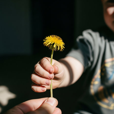 Child's small hand offering a crushed dandelion to a parent. Candid, harsh light, visible skin textu