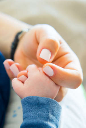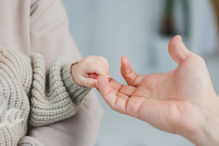 A parent's hand cradle a baby's small fingers, symbolizing warmth and affection in a serene atmosphere. This intimate gesture conveys deep emotional bonds.