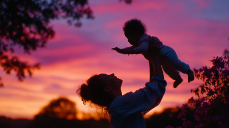Mother joyfully lifts her baby against a vibrant sunset silhouette in a serene outdoor setting during the early evening