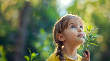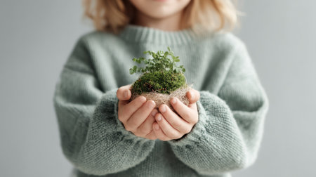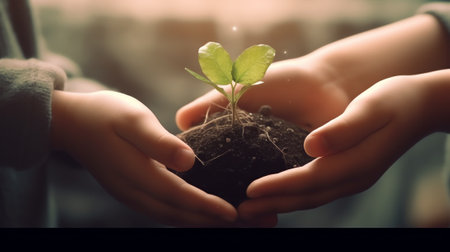 A young child's hands gently cradle a small green plant, symbolizing hope and new beginnings in a vibrant garden, illuminated by natural light.
