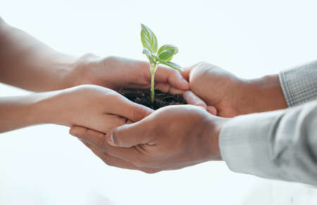 Plant growing in the soil held in the hands symbolizing growth, Agriculture, Grow food. Caring for the environment. ESG. High quality photo
