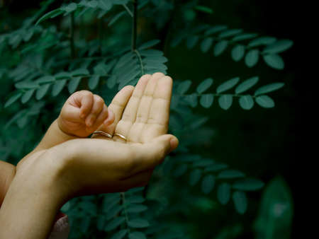 Mother and child hands on nature background. Family support, help and trust. Parent holds the hand of a child on a walk. Kid and mother hands, closeup. Love, relationship and teamwork in family.