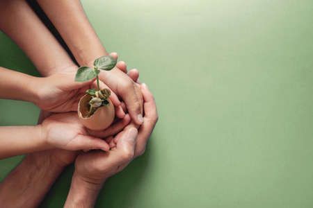hands holding seedling in eggshells, montessori education , CSR Corporate social responsibility, Eco green sustainable living concept,zero waste, plastic free,world food day, responsible comsumption