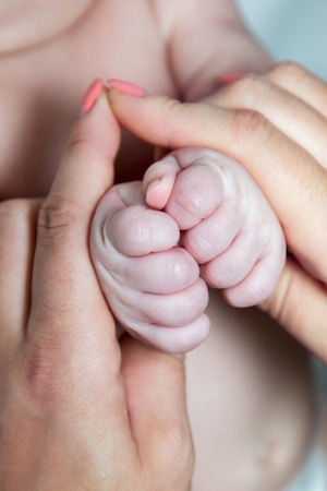 Mother holding newborn hands. Tenderness moment between mother and daughter.
