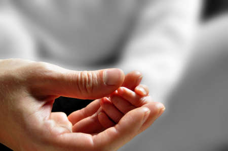 Mother uses her hand to hold her babys tiny hand to make him feeling her love, warm and secure.