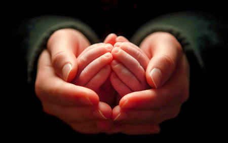 Parental bond: gentle adult hand delicately touching a newborn baby's tiny fingers, symbolizing love, care, and protection